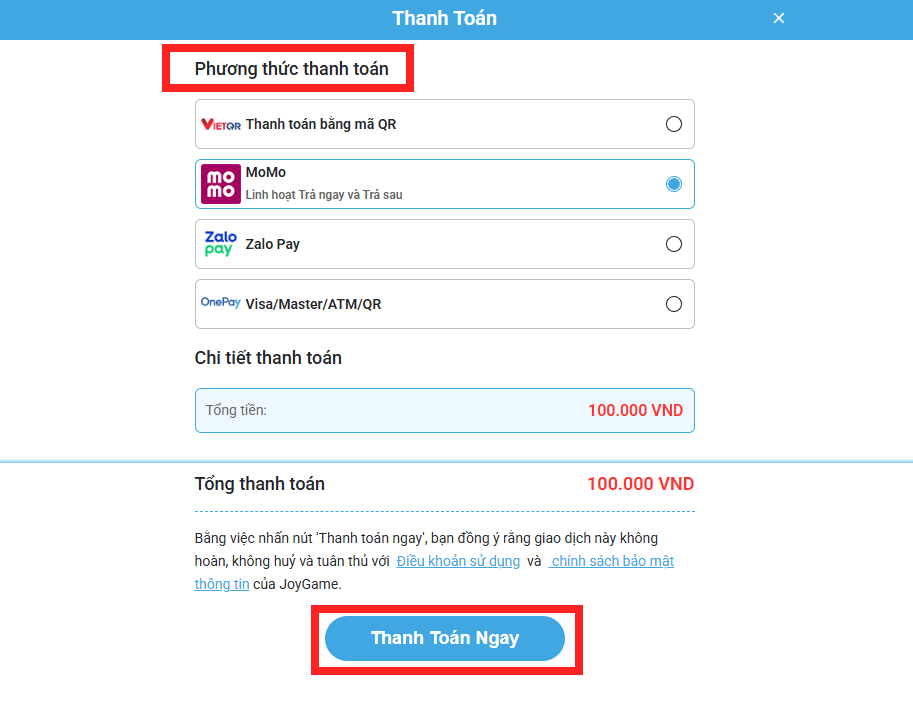 Bước 4: Chọn hình thức thanh toán, sau đó bấm Thanh Toán Ngay