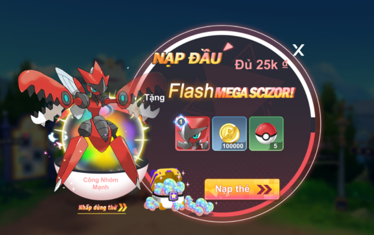 - Chỉ cần nạp gói bất kì như mua gói Kim Cương Màu hay gói Giới Hạn,HLV sẽ nhận được Mega Scizor SSR (dạng Flash) và các vật phẩm khác.