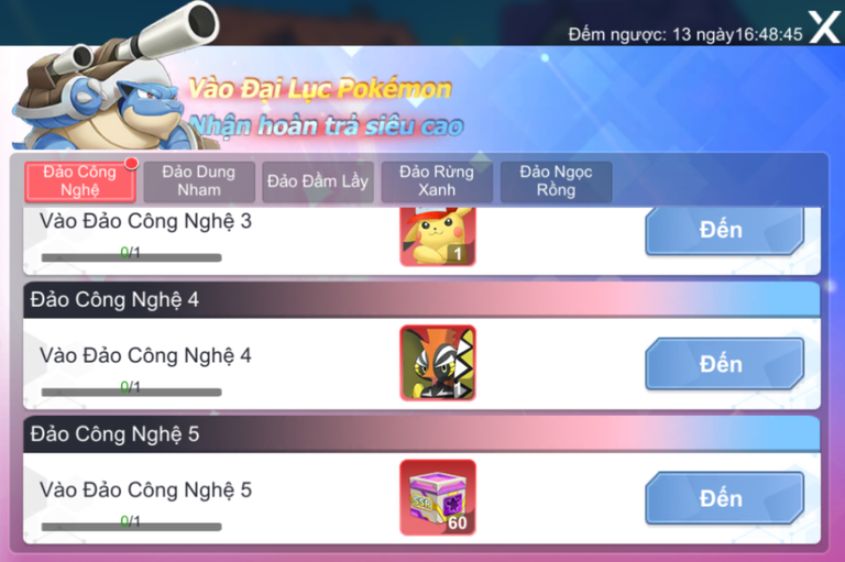 - Trong thời gian diễn ra sự kiện, hoàn thành các nhiệm vụ vào đảo đại lục nhận nhiều mảnh và đặc biệt pokemon SSR như: Pika (SSR), Tapu Koko (SSR), Ho-Oh (SSR), Mega Charizard X (SSR), Mega Venusaur (SSR), Zygarde (SSR), Mega Blastoise (SSR), Suicune (SSR), Mega Garchomp (SSR), Rayquaza (SSR).
