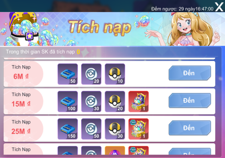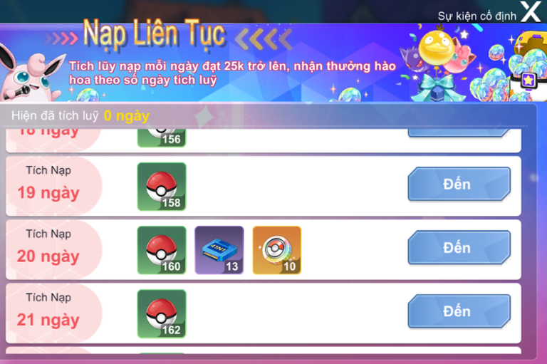 - Nhiều mốc tích nạp với phần thưởng giá trị cao như: KC Màu, Ditto Tinh Anh, Túi Pokémon Hình Thái 5 Hệ-Chọn (Bản Năng Thường Lv.1), Túi Pokémon Hình Thái 5 Hệ-Chọn (Bản Năng Thường Lv.3), Túi Pokémon Hình Thái 5 Hệ-Chọn (Bản Năng Flash Lv.3).