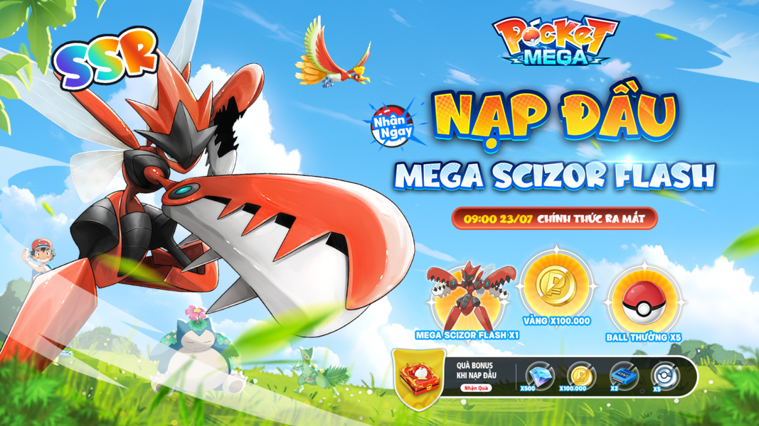 - Quà Nạp Đầu nhận Mega Scizor bản năng Flash, sau khi HLV thanh toán gói nạp bất kỳ, giao diện chính sẽ xuất hiện banner nhận quà.
