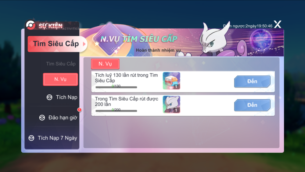 - Tích lũy 130 lần rút trong Tìm Siêu Cấp nhận: Mewtwo SP Lv.5 hoặc Ditto SP Bản Năng Thường Lv.5 (Điểm cá thể 110)