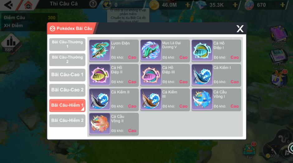 - Người chơi có thể ở tại Pokédex Bãi Câu tìm xem mỗi bãi câu có thể xuất hiện những loại cá nào.