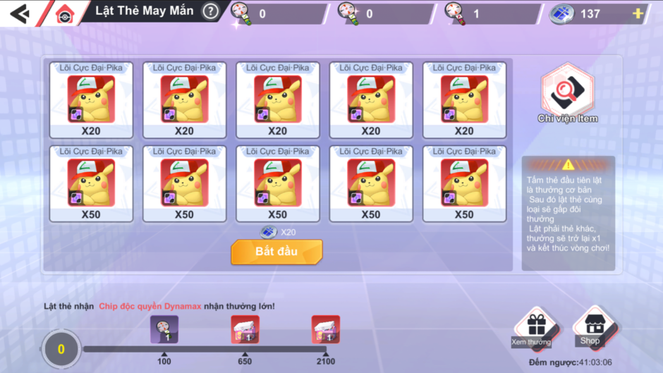 Trước mỗi lần bắt đầu, có thể xem 2 loại thưởng trong vòng này. Mỗi loại thưởng sẽ có 5 tấm thẻ tương ứng (Thưởng SK này là Chip Dynamax của các Pokémon, hãy chọn cẩn thận!)