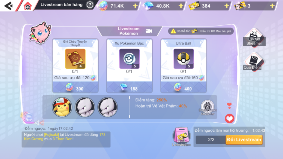 - Vật phẩm Livestream: Mỗi livestream bán cố định 3 vật phẩm, vật phẩm có thể hưởng các loại ưu đãi từ Pokémon Livestream.